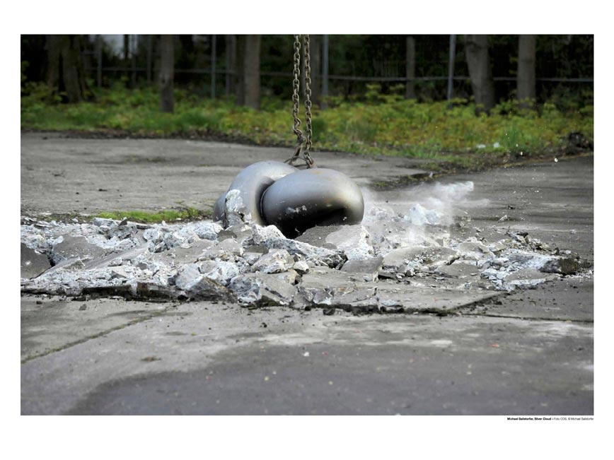 MS: Ich glaube, bei meinen Installationen interessiert mich vor allem das Umschlagen von Zerstörung in Gestaltung, oder zumindest die Destabilisierung dieser beiden Vorstellungen. In beiden Fällen inszeniere ich einen Abbruchprozess. Die Abrissbirnen setzen den Abbruch aber in neue Kontexte – regnende Tropfen, oder eine regnende Wolke üben eine physikalische Wirkung auf das Bauwerk oder die Betonplatten aus, die eher an einen Meteoritenregen denken lässt. Der Zerstörungsprozess hat also eine bildnerische Kehrseite, die eine zusätzliche Realitätsebene hinzufügt – ein Raum der Möglichkeiten. In diesem Raum können sich Phänomene plötzlich anders darstellen und abspielen, und Ursache und Wirkung lassen sich nicht mehr unmittelbar zuordnen.